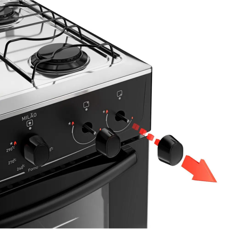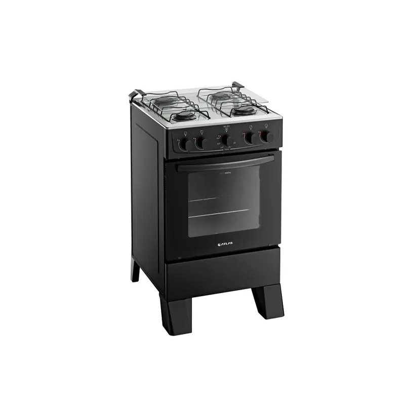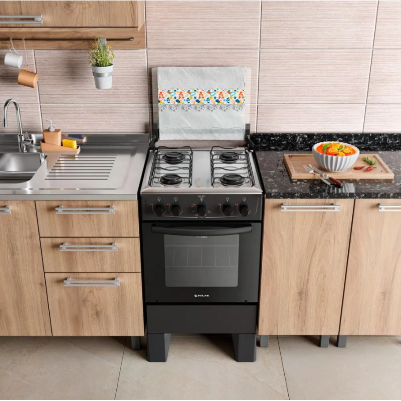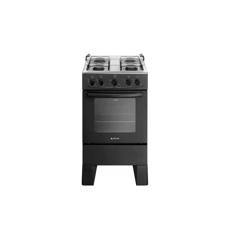 O Fogão 4 Bocas Atlas Milão é bonito, prático e fácil de limpar. Do jeito que sua cozinha merece! Possui mesa em inox com tampa de vidro, que protege sua parede de respingos enquanto cozinha; acendimento manual; grades duplas; queimadores mais robustos e fáceis de limpar; além de pés altos e botões removíveis, que facilitam na hora da limpeza. O forno possui capacidade de 50 litros, uma grade deslizante e é revestido com o acabamento Limpa Fácil.