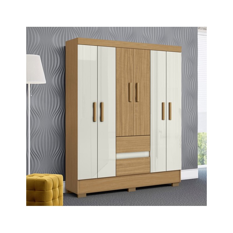 O Guarda-Roupa Coimbra 6 Portas possui excelentes divisões internas, oferecendo amplo espaço para armazenamento de roupas e pertences. Possui um cabideiro de madeira revestido em PVC para sustentar roupas de forma durável. Suas duas gavetas contêm corrediças metálicas para um deslize suave, além de facilitar a organização. O acabamento em verniz texturizado fosco conserva o móvel, proporcionando beleza, resistência e durabilidade.
