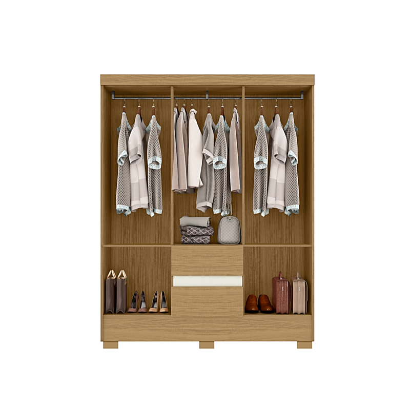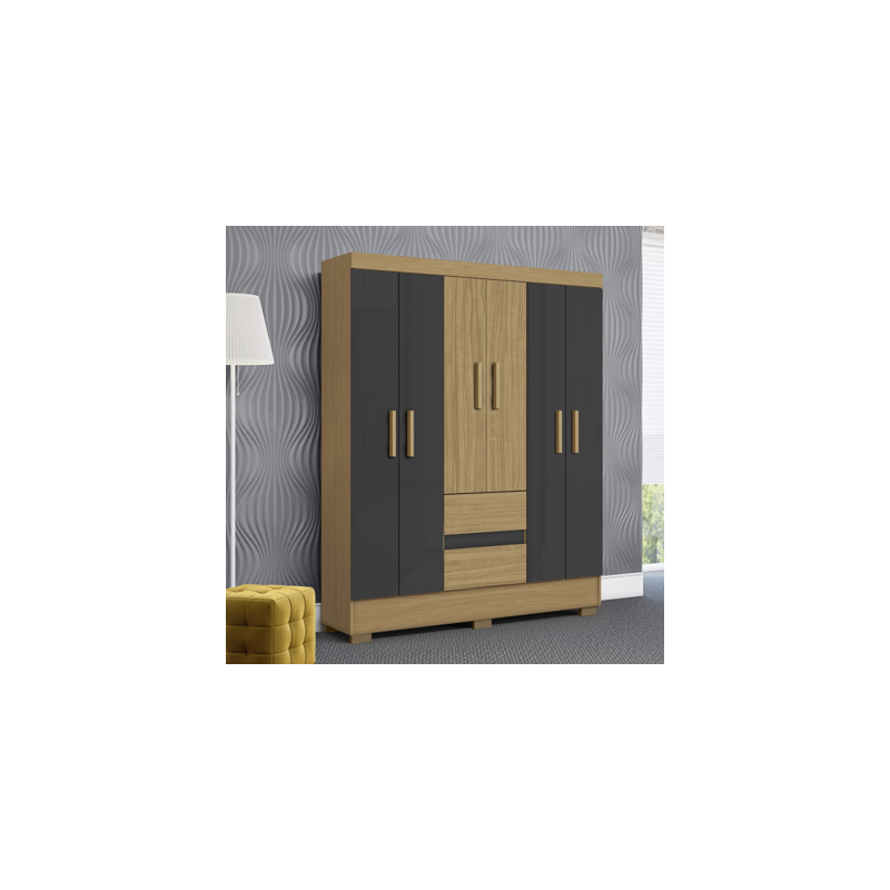 O Guarda-Roupa Coimbra 6 Portas possui excelentes divisões internas, oferecendo amplo espaço para armazenamento de roupas e pertences. Possui um cabideiro de madeira revestido em PVC para sustentar roupas de forma durável. Suas duas gavetas contêm corrediças metálicas para um deslize suave, além de facilitar a organização. O acabamento em verniz texturizado fosco conserva o móvel, proporcionando beleza, resistência e durabilidade.